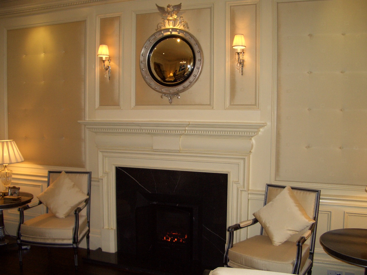 | Ivory painted with ivory silk monogram fabric. Showing the Clive Christian Empire Bergere Chairs. |